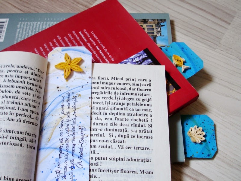Plecând de la preferința partenerei de schimb pentru culoarea albastru, am creat un set format din cerceluși și colier în nuanțe de bleu-senin, albastru-safir și auriu. Alături, i-am pregătit un grup de semne de carte pentru zilele lungi vară, semne ce au mici detalii de inspirație marină și citate din Micul Prinț.
